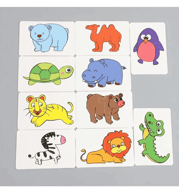 Com 32 peças em papel resistente, o jogo funciona como um puzzle estilo tangram/jigsaw, no qual a criança deve completar imagens com padrões de desenhos animados de animais. É um brinquedo perfeito para treinar: